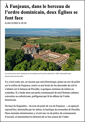 C’est la question, certes provocatrice mais pas sans fondements, que pose Héloïse de Neuville dans un article de La Croix du 4 décembre sous le titre : « À Fanjeaux, dans le berceau de l’ordre dominicain, deux Églises se font face » ( Voir le texte de l'article en bas de cette lettre ) à laquelle répond Jean-Pierre Maugendre dans la lettre de Renaissance Catholique.