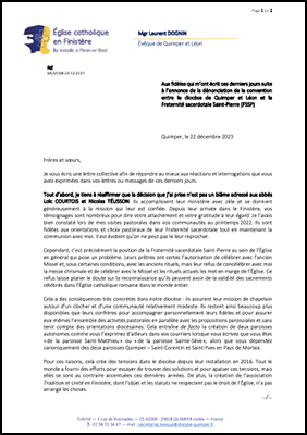 Dans une lettre du 22/12/2023, Mgr Dognin, Evêque de Quimper et Léon, s’adresse à un parterre collectif. « Aux fidèles qui m’ont écrit ces derniers jours suite à l’annonce de la dénonciation de la convention entre le diocèse de Quimper et Léon et la Fraternité Saint-Pierre(FSSP), l’évêque entend « répondre au mieux aux réactions et interrogations exprimées dans vos lettres ou messages de ces derniers jours.