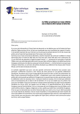 Mgr Dognin vient d'envoyer ( enfin ! ) une lettre aux fideles qui participent aux messes celebrées avec le missel de 1962à Quimper et à Saint-Séve.
